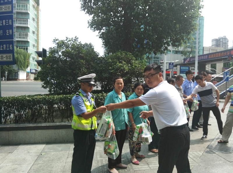 8月25日,市委编办机关志愿者服务支队支队长何浩率队看望慰问城区花园小区十字路口的交通警察、环卫工人、小区保安等一线工作者,为他们送去防暑降温物品,感谢他们冒酷暑、战高温的辛勤工作,对他们建设幸福美丽绵阳所作出的贡献表示崇高敬意。